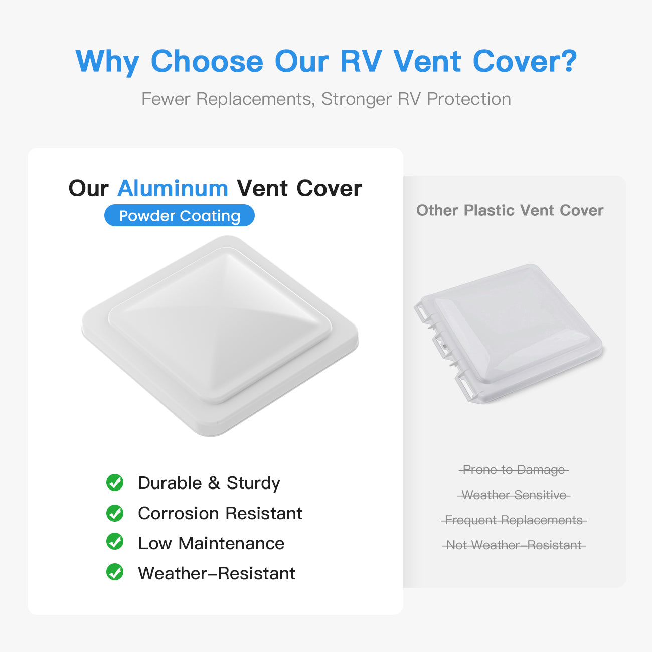 Excellent Replacement Vent Cover for RV Roof!The Aluminum RV Vent Cover Replacement was exactly what I needed to upgrade my camper’s roof vent. This 14"x14" cover has a universal fit, so installation was quick and easy with no modifications needed. It’s made from durable aluminum, which feels much more solid and weather-resistant than the plastic ones I’ve had in the past. The white finish reflects sunlight well, helping to keep the interior cooler. This is a high-quality vent cover that provides reliable protection—definitely a worthwhile investment for any RV owner!