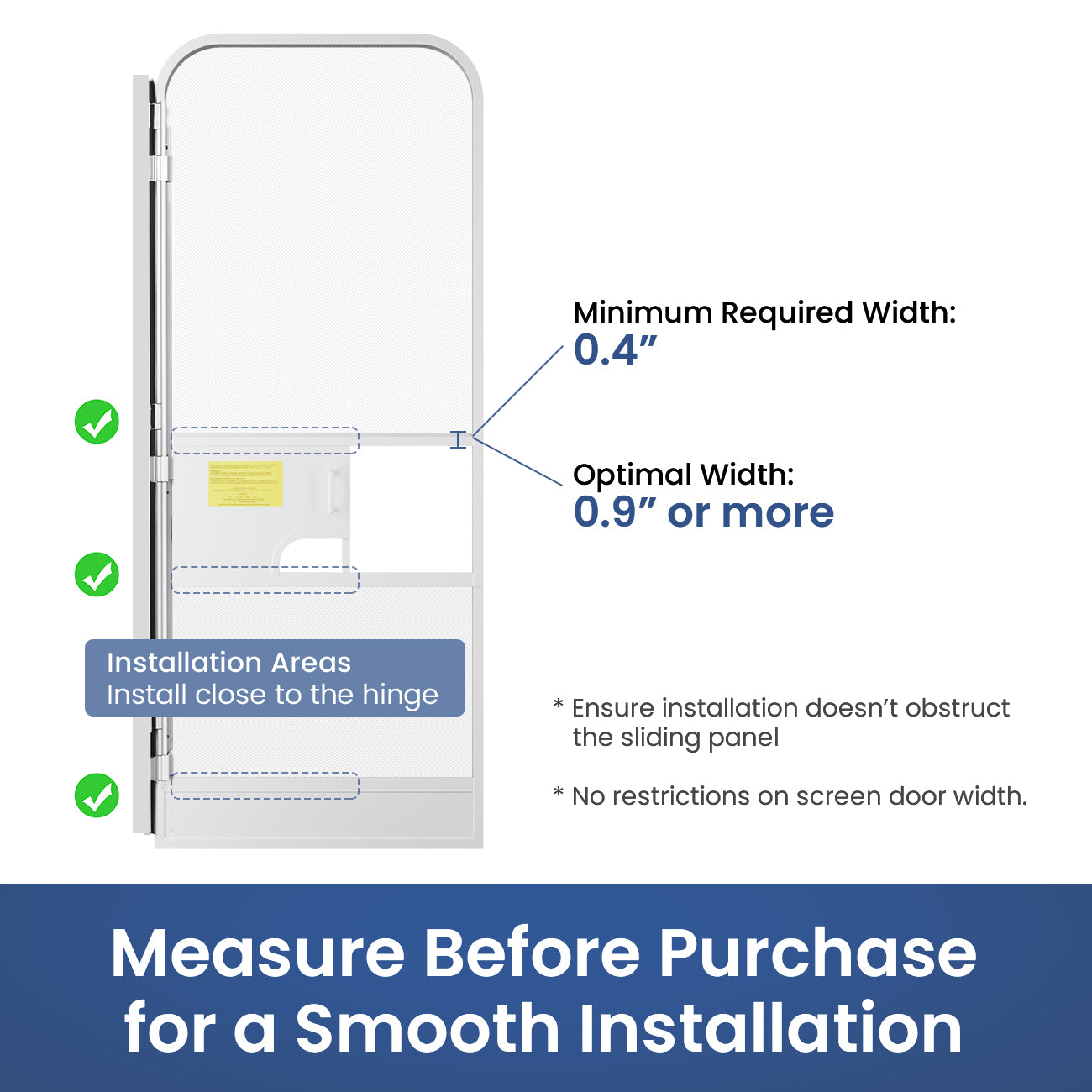 ● Universal Fit for Most RV Screen Doors: Compatible with most RV, camper, and travel trailer screen doors. Requires a minimum clearance of 0.4 inches for installation, though 0.9 inches or more is ideal for optimal performance. Not designed for household screen doors.