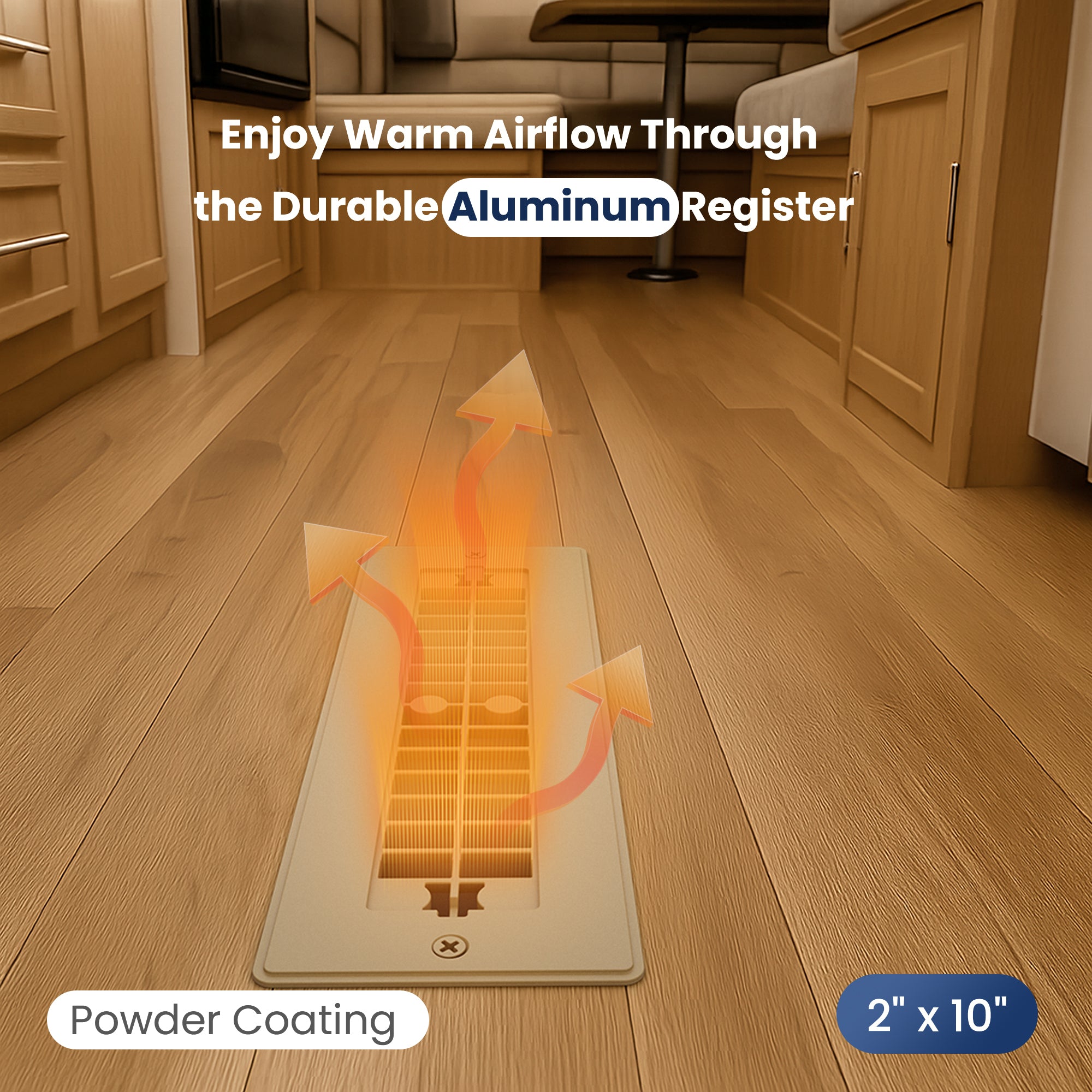 Crafted from heavy-duty aluminum with a sleek powder coating finish, this RV floor register is built to resist rust, scratches, and warping — lasting longer than fragile plastic vents.