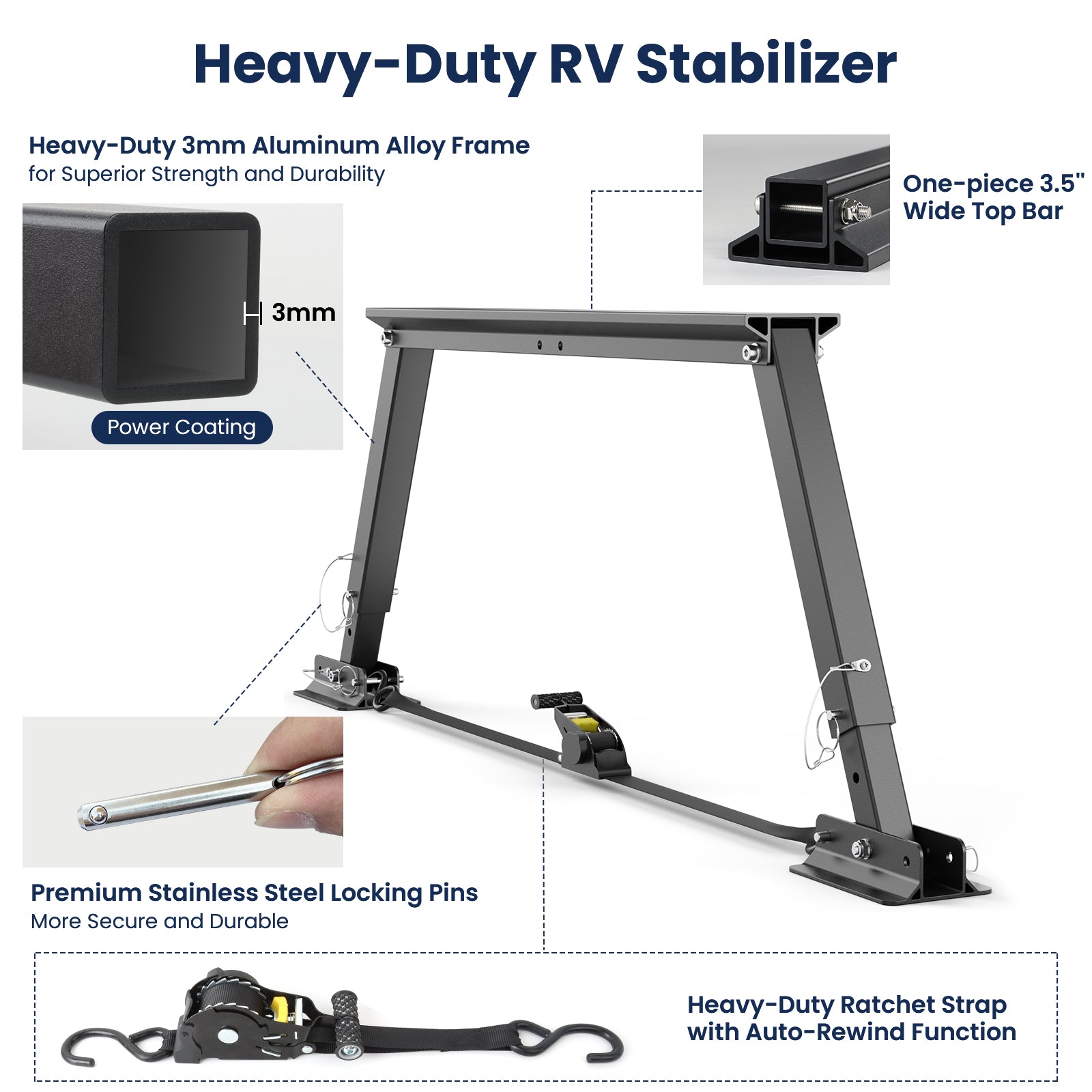 ● Wider Top Bar for Extra Stability – 3.5'' aluminum top increases contact with your RV, preventing weak points and wobble.